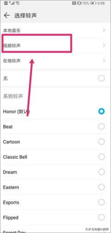 3、这时我们能够看到“卡1和卡2来电铃声”,我们选择你需要设置视频来电秀的手机号。这时,我们点击“视频铃声”,就能进入到视频来电秀的设置界面了。