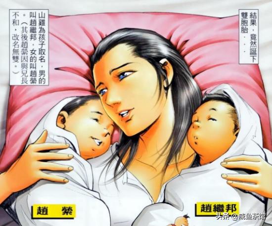 丁瑶给山鸡生了一对龙凤胎,男的取名赵继邦,女的取名赵萦,后改名赵无双,就是赵云三国无双的意思。