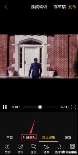 在视频编辑页面声音、片段编辑、高级编辑、设置四个模块中,点击“片段编辑”模块进入片段编辑页面。
