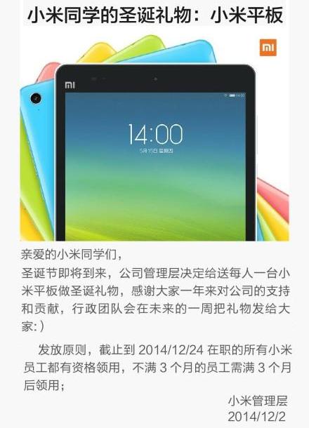 7、圣诞节礼物:送每位员工一台小米平板电脑,拿回家玩儿去。
